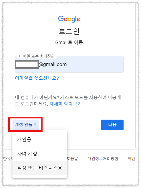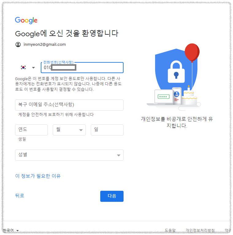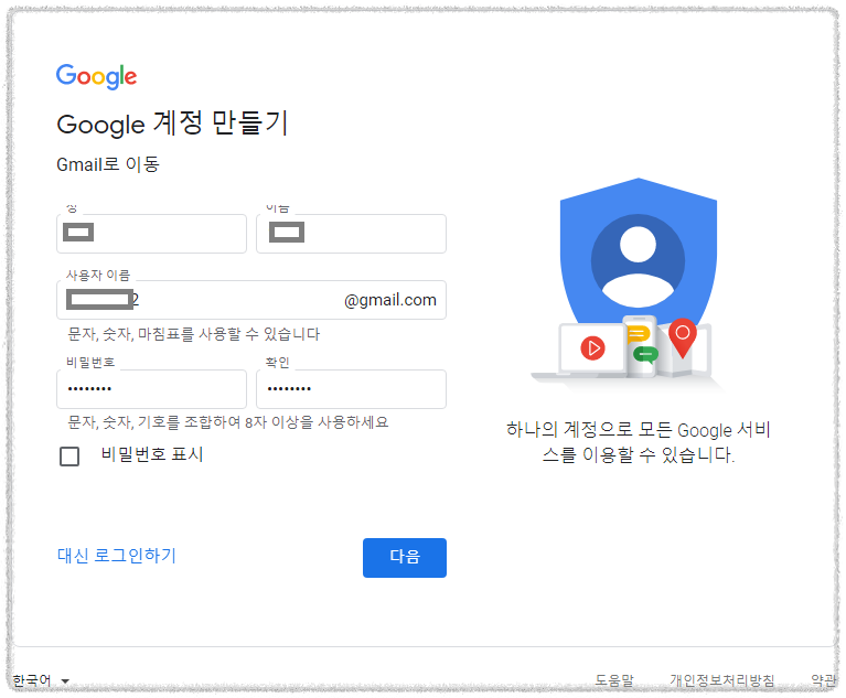 각각의 정보들을 입력해주고 새로만들고자 하는 g메일 아이디도 입력해주세요
