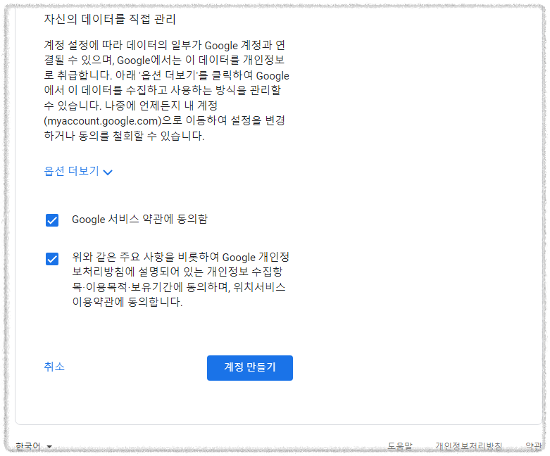 약관 동의 체크 하고 계정만들기를 눌러주면 끝이납니다.