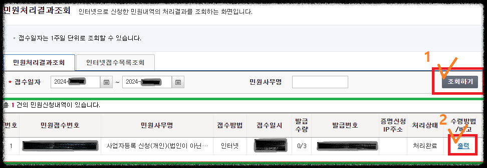 조회하기를 누르면 신청한 민원이 나옵니다.