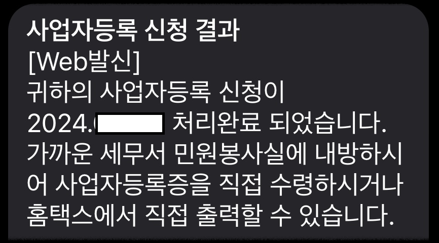 문자로 사업자 등록 신청 처리완료되었다라는 메세지를 받으셨다면,