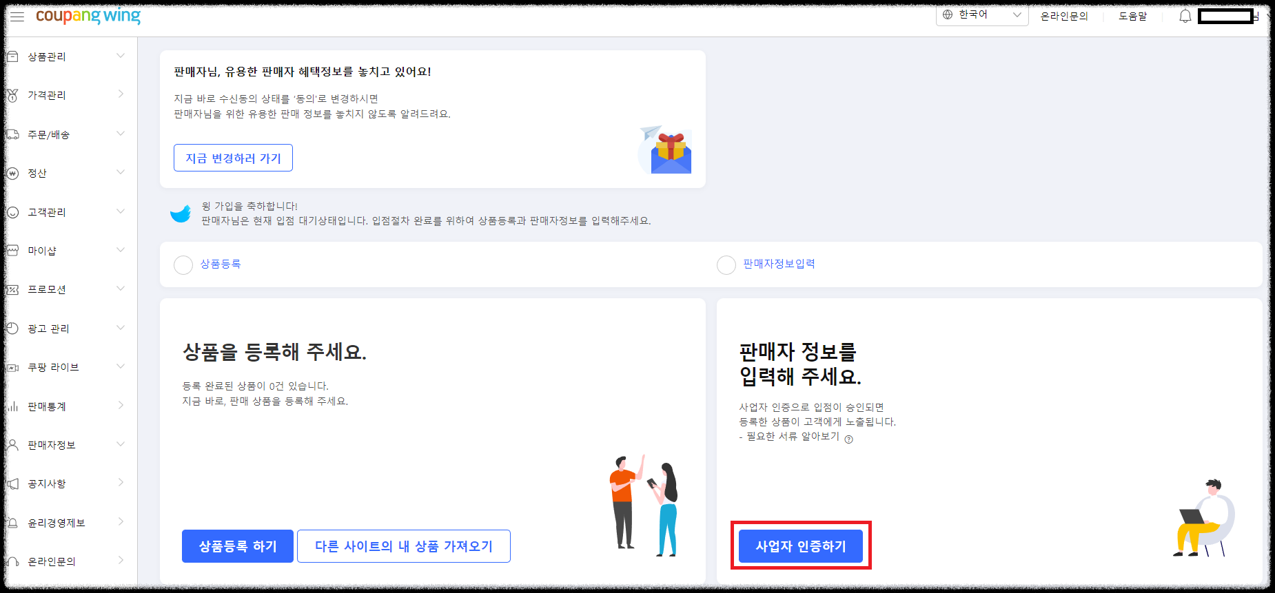 판매자센터 화면에서 입점 승인이 진행 중이라는 문구가 보이실 거에요!