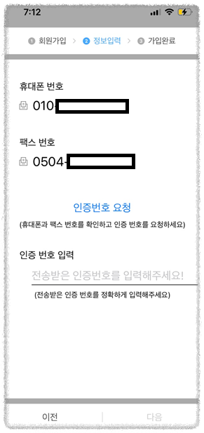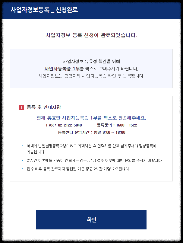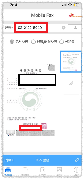 팩스번호 선택화면과 함께 인증 후, 휴대폰에 있는 사업자등록증 사진파일을 해당 번호로 송부하면 끝이 납니다.