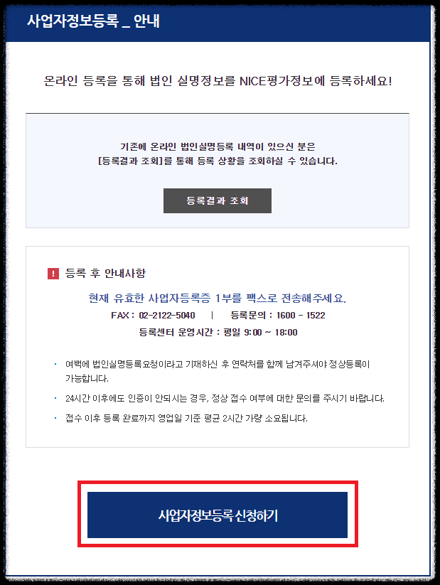 신규사업자 가입자분이라면 NICE평가정보에 사업자 등록을 해야합니다.