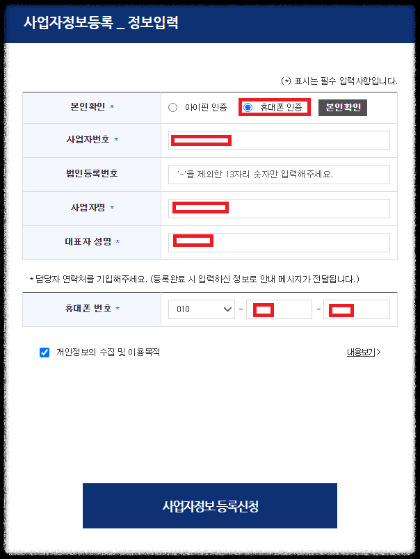 본인인증을 진행해주시고 각각의 정보를 입력한 후 "사업자정보등록신청" 을 클릭해주세요