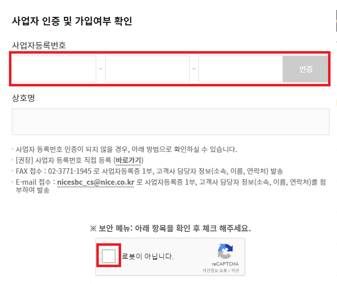 로봇 아님 인증과 사업자 번호를 입력하여 주세요
