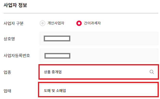 업태는 도매 및 소매업으로 입력해주시면 됩니다.