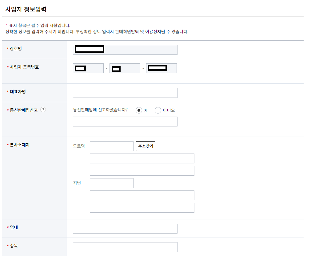 사업자등록증에 나온 것과 동일하게 해당 정보들을 입력해줍니다.