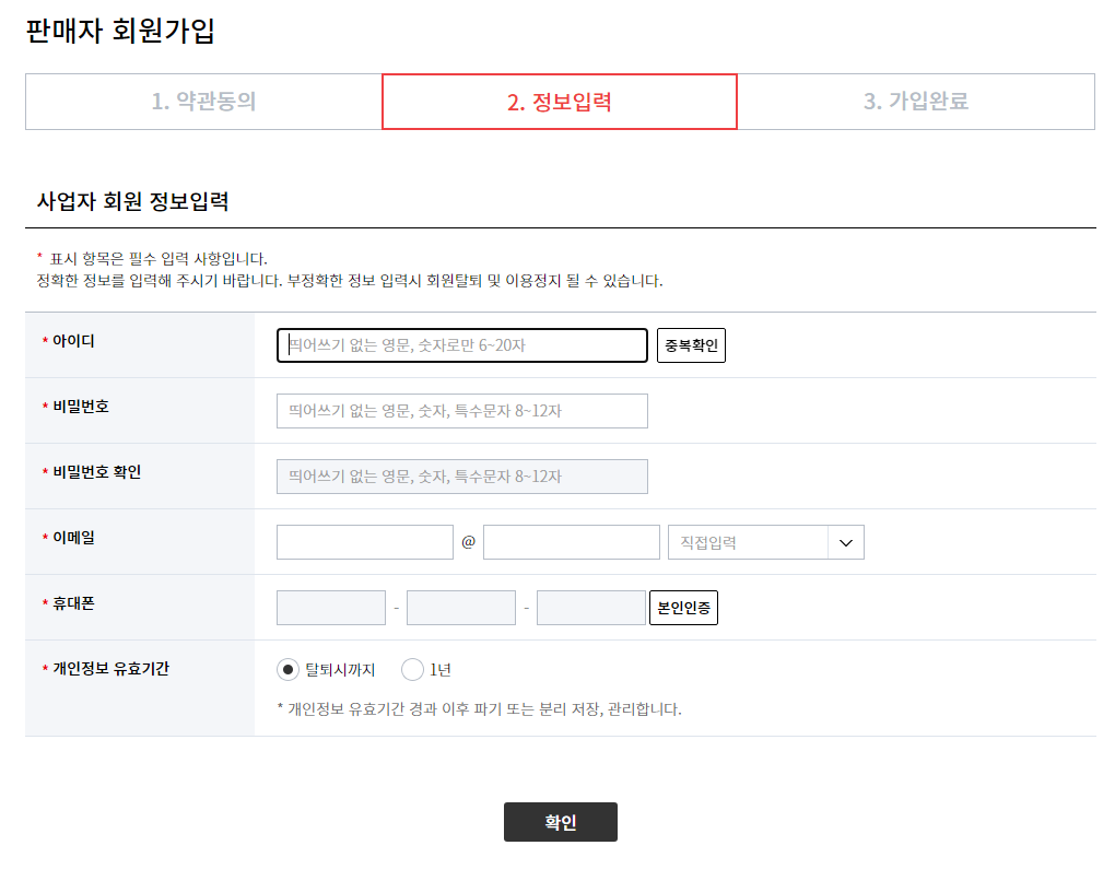 아이디/비밀번호 설정 후 핸드폰 인증까지 한 후 확인을 눌러주면 다음단계로 넘어가게 된다.