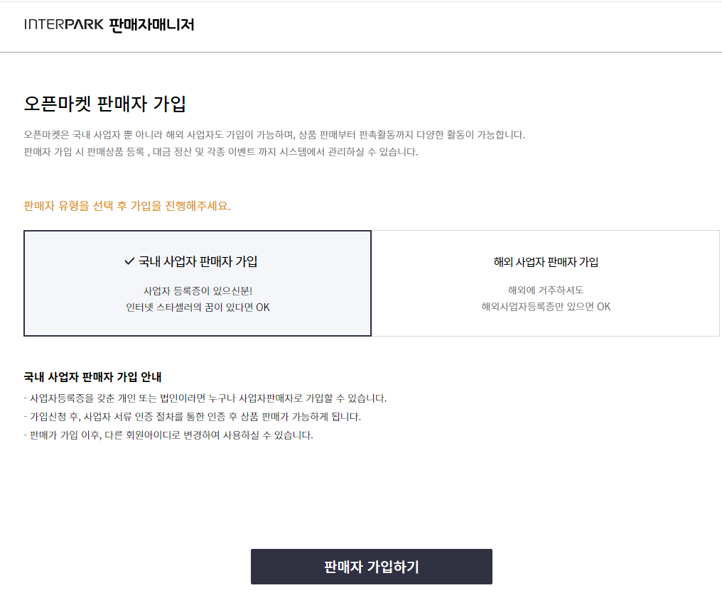 인터파크 오픈마켓 판매자 가입을 위한 서비스 안내 페이지, 판매자센터