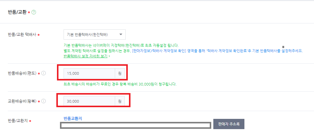 반품 배송비는 넉넉하게 입력해주시고 반품교환지는 직접 상품을 받을 수 있는 곳으로 입력해주세요.