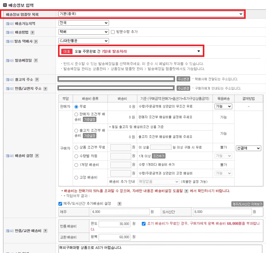 나머지는 '제주/도서산간 추가배송비설정' , '반품,교환배송비' 입력 완료해주세요