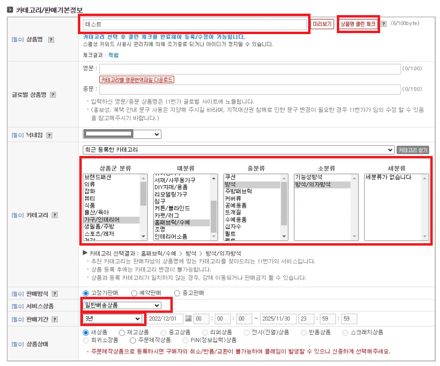 카테고리를 먼저 선택해주시고 상품명 입력 뒤 '상품명 클린 체크' 까지 눌러주세요
