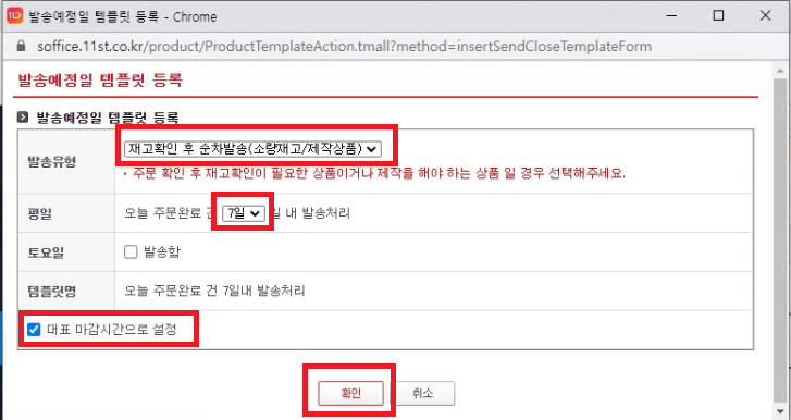 그 다음은 '발송예정일 템플릿 등록' 을 클릭해주세요