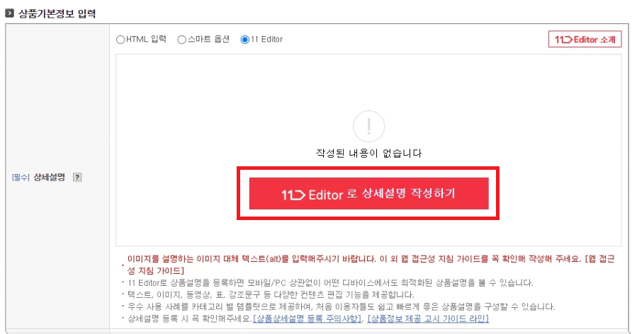 상세설명 입력을 위해 '11Editor 로 상세설명 작성하기'를 눌러주세요