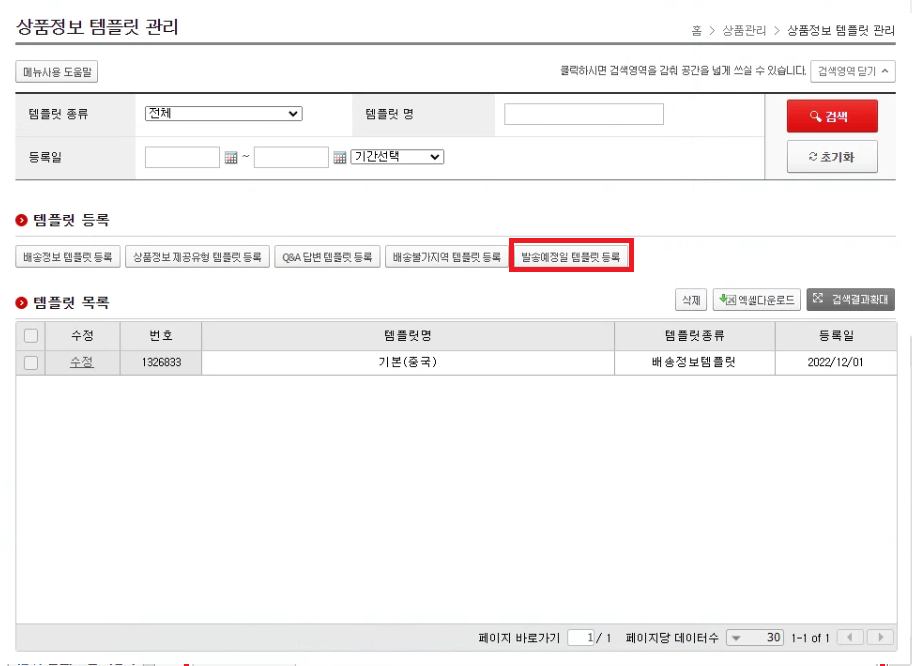 왼쪽 메뉴에서 '상품관리'-'상품정보 템플릿 관리' 를 클릭해주세요