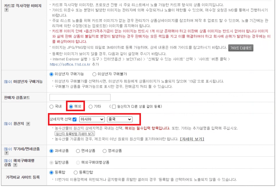 원산지 해외 체크 후, 상세지역 입력해주세요