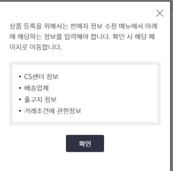 그럼 배송정보와 CS정보를 입력하라는 팝업창과 함께 아래 메뉴로 넘어가게 됩니다.