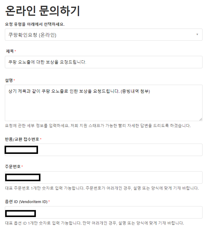 회수가 완료 이후 '쿠팡확인요청' 을 통해 보상 신청을 할 수 있다.