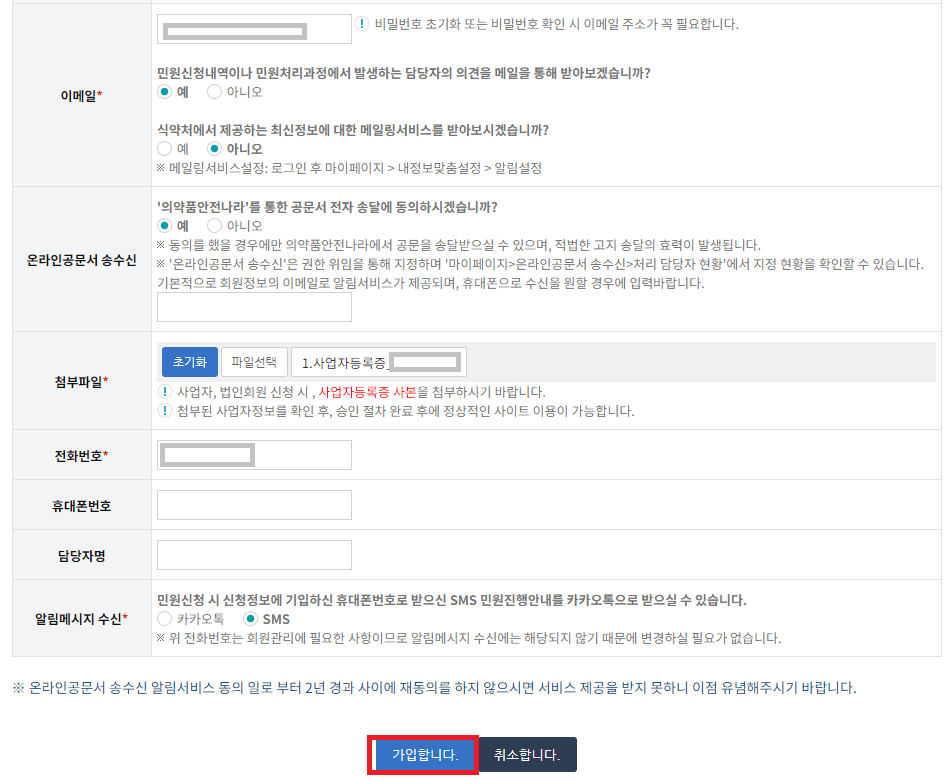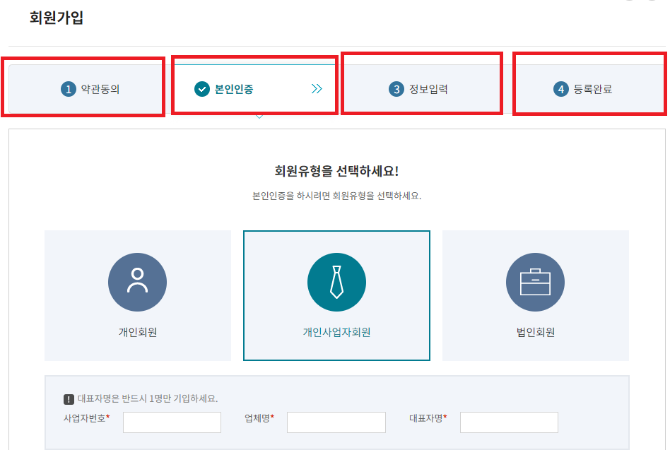 약관동의 후, 개인사업자회원으로 사업자번호를 통해 가입하여주세요