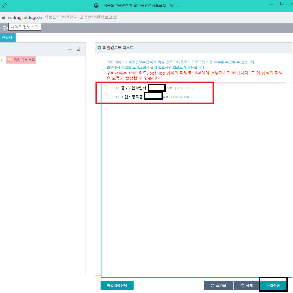 그리고 왼쪽 상단의 업로드 할 '기타 구비서류' 클릭한 후 '파일전송'을 눌러주세요