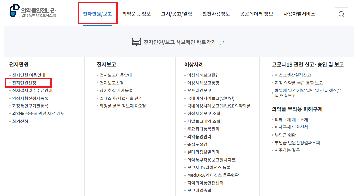 로그인 후, 상단 메뉴에서 '전자민원/보고' 클릭하여 주시고 세부 메뉴에서 '전자민원신청' 을 클릭하여 주세요