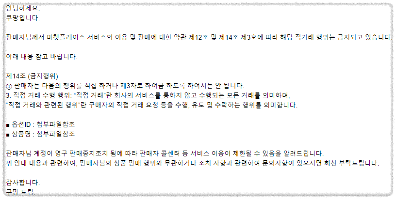 1. 쿠팡 직거래 유도로 인한 판매정지