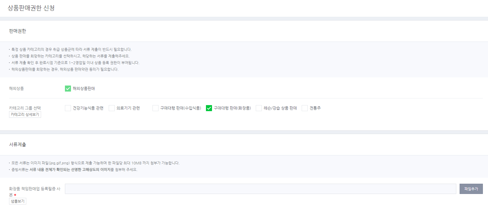 확인해보니 네이버는 미리 책임판매업 등록필증을 업로드 해야 가능하다.