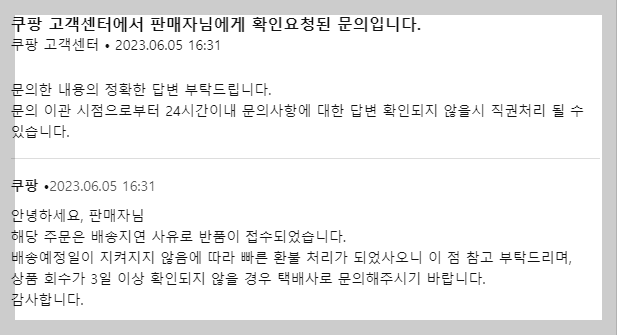 고객과의 어떠한 소통도 없이 바로 환불처리 되는 쿠팡시스템에 안내메세지를 볼때면 심장이 철렁한다.