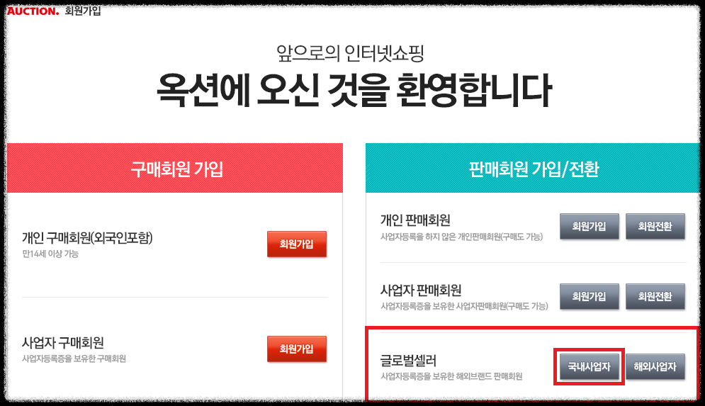 위 화면에서 '글로벌셀러' 에서 '국내사업자' 를 선택해주세요